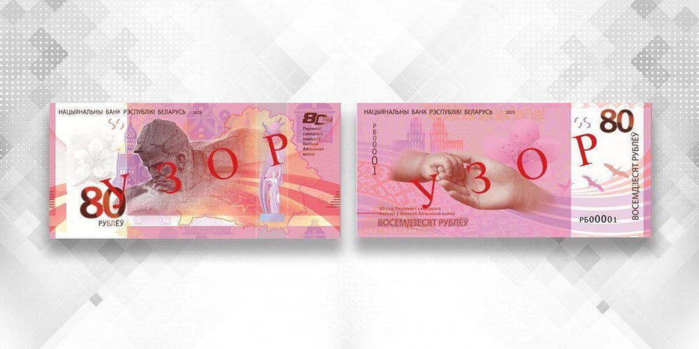 В честь юбилея Победы в Беларуси будет выпущена новая банкнота достоинством 80 рублей. На одной из сторон банкноты можно увидеть монумент «Мужество» в Брестской крепости и скульптуру «Родина-мать». На другой стороне изображена рука матери, держащая руку ребёнка, и архитектурный комплекс «Ворота Минска».