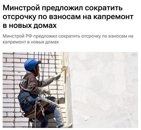 Плата за капитальный ремонт в новостройках. Министерство строительства предлагает обязать россиян платить за капитальный ремонт новостроек через год после заселения, а не через пять лет, как это предусмотрено действующим законодательством. Соответствующие поправки в Жилищный кодекс уже подготовлены. В ведомстве объяснили, что в современных домах установлено дорогостоящее оборудование и использованы высокотехнологичные материалы, которые изнашиваются уже с момента ввода здания в эксплуатацию.