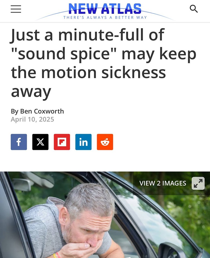 Теперь укачивание в машине можно лечить без таблеток — учёные нашли эффективный способ. Исследователи создали специальный звук под названием «Sound spice» с частотой 100 Гц и уровнем громкости 65,9 дБА, который эффективно уменьшает тошноту и головокружение. Чтобы почувствовать облегчение, достаточно всего лишь послушать его в течение одной минуты.