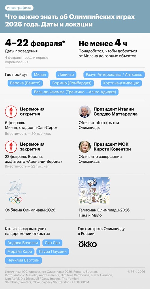 Соревнования на Олимпиаде 2026 года начались 4 февраля, но церемония открытия пройдет 6 февраля на «Сан-Сиро». Для легендарного футбольного стадиона она станет последним крупнейшим событием. Осенью начнутся работы по сносу арены, которой в сентябре исполнится 100 лет. На Играх из-за санкций выступят только 13 россиян в нейтральном статусе без гимна и флага, как в последние восемь лет. Но на предыдущей зимней Олимпиаде выступили 209 россиян. Всего на Олимпиаде за другие сборные выступят 26 сменивших спортивное гражданство россиян. Подробнее — в инфографике РБК. [mondiara.com](https://mondiara.com) 👆 Больше новостей и анализа