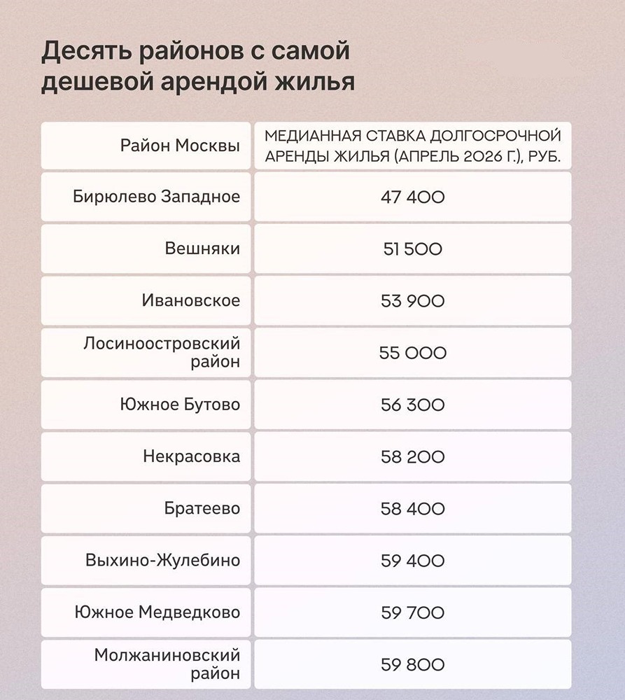 Аренда жилья в центре Москвы в среднем стоит 182 тыс. рублей, подсчитали аналитики. В Новой Москве ставки заметно ниже — около 35 тыс. рублей. Самыми дорогими остаются Центральный, Западный, Северо-Западный и Северный округа, а среди самых доступных районов — Бирюлёво Западное, Вешняки и Южное Бутово.