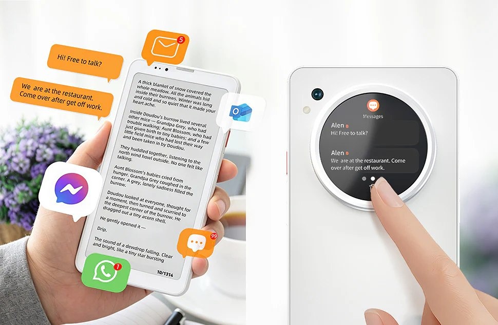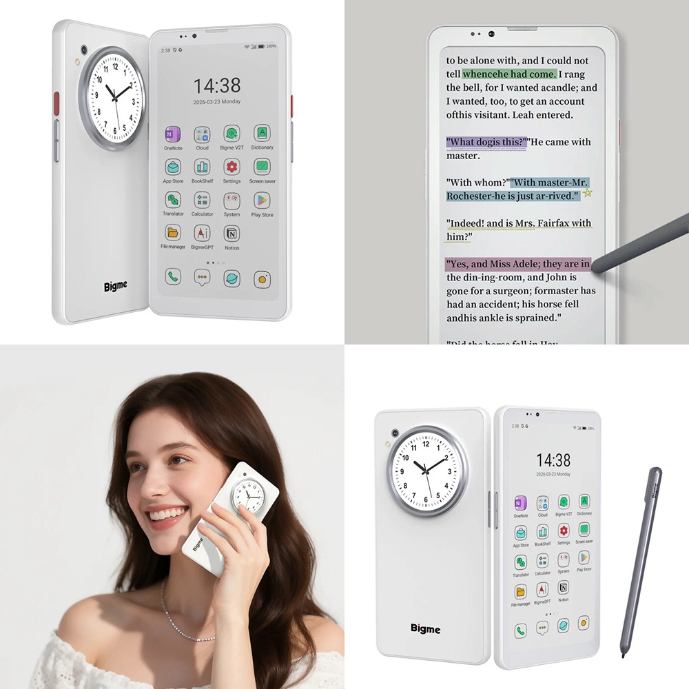 YotaPhone наоборот: Bigme HiBreak Dual — очень странный смартфон с e-ink. Его позиционируют как первый в мире смартфон с двумя экранами, один из которых — цветной дисплей e-ink. Разрешение у него невысокое, зато частота обновления для электронной бумаги достойная — аж 53 Гц. И есть поддержка стилуса! Характеристики: • 6,13-дюймовый дисплей e-ink разрешением 1648 × 824 пикселя (300 PPI) у чёрно-белой версии и 842 × 412 точек (150 PPI) у цветной. Частота обновления 53 Гц; • дополнительный LCD-экран с разрешением 360 × 360 пикселей для уведомлений и виджетов; • MediaTek Dimensity 1080; • 8/128 ГБ, 12/256 ГБ; • основная камера на 20 Мп и камера для селфи на 5 Мп; • Android 14, две SIM, батарея 4500 мА·ч. Это скорее продвинутая электронная книга, чем современный смартфон: HiBreak Dual предлагает сильно меньше среднего бюджетника. Цветной E-Ink-экран вообще непонятно зачем с таким разрешением нужен, кроме понтов. Дополнительный экранчик в «шайбе» отдали под уведомления и виджеты. При получении уведомления надо будет переворачивать смартфон? Сомнительно. Но с автономностью вроде порядок: обещают до пары дней работы и неделю в режиме ожидания. Стоимость разнится в зависимости от версии: версия с чёрно-белым экраном на 8/128 ГБ обойдется в $410 (~ 37 тысяч рублей), а такая же с цветным дисплеем — в $440 (~ 40 тысяч рублей). 12/265 ГБ будут на $70 и $60 дороже соответственно. Ещё и стилус с чехлом нужно покупать отдельно за $40 (~ 3000 рублей). При этом на сайте по предзаказам уже всё распродано, поэтому в розницу цены наверняка будут выше.