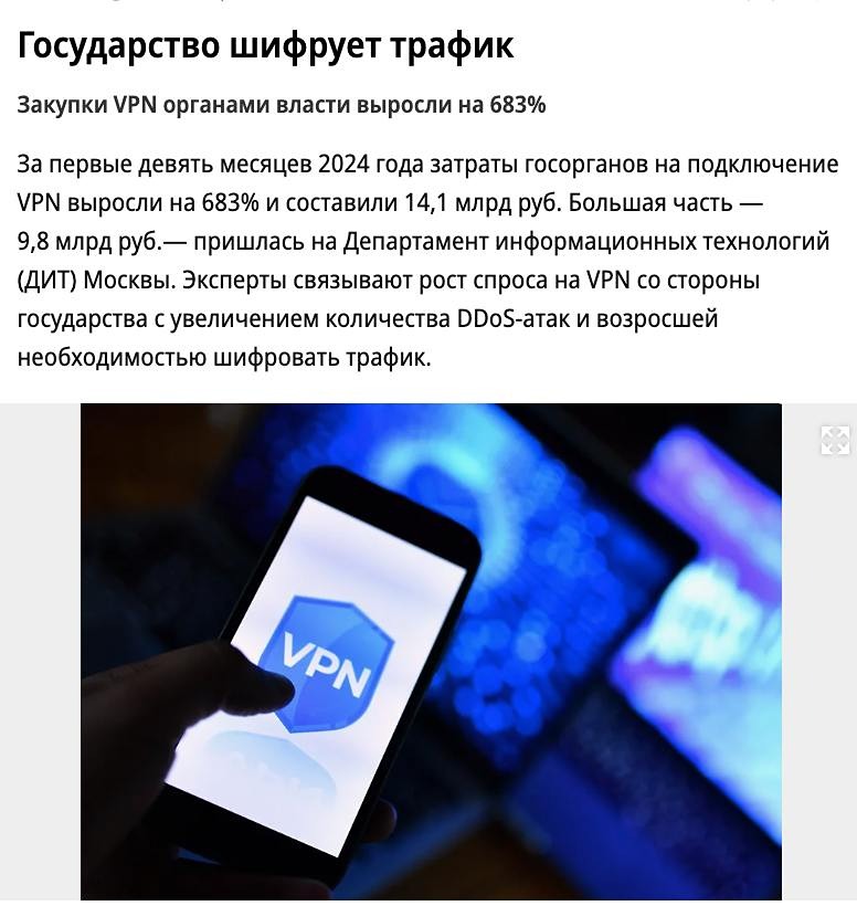 Закупки VPN для государственных органов в России увеличились на 683%. За первые девять месяцев 2024 года расходы на подключения к VPN достигли 14,1 миллиарда рублей, при этом наибольшая сумма, 9,8 миллиарда рублей, была потрачена Департаментом информационных технологий Москвы. Эксперты подчеркивают, что такие сервисы стали актуальными из-за роста числа DDoS-атак и необходимости защиты трафика. При этом закупки VPN для доступа к заблокированным сайтам и сервисам в России не производятся.
