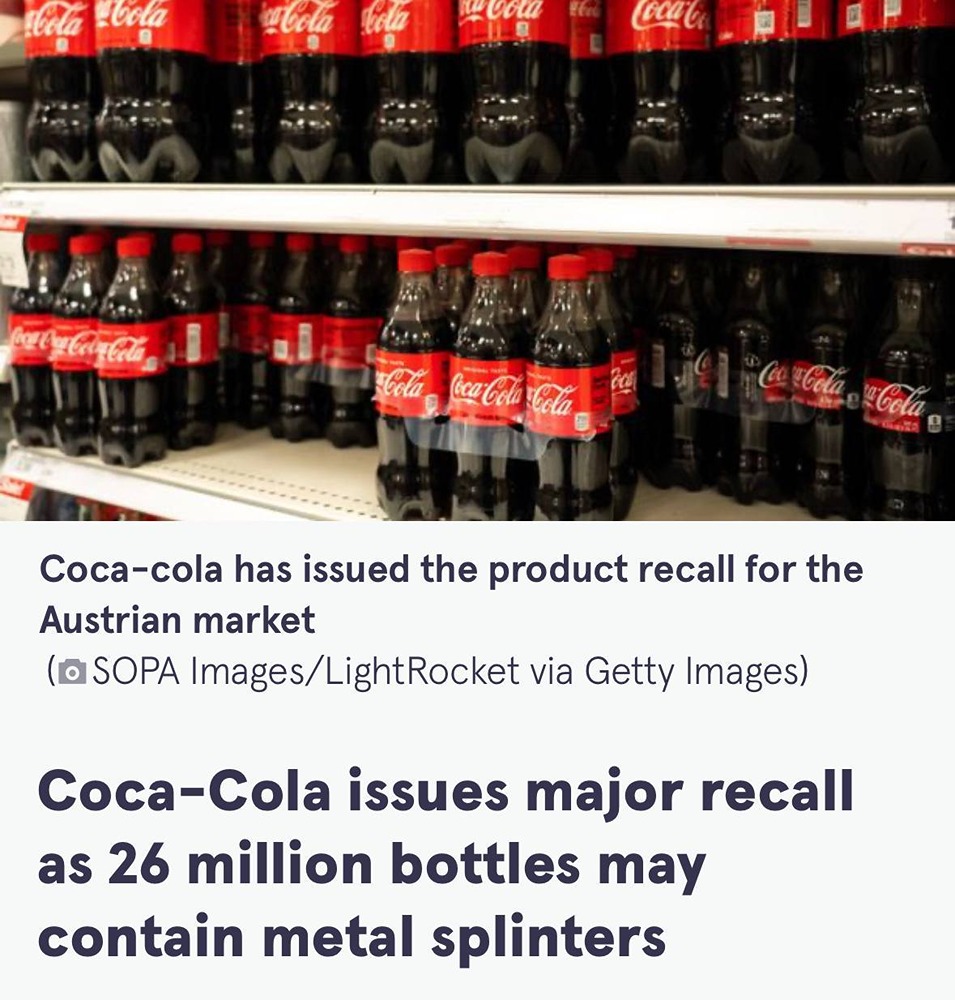 В Coca-Cola в Австрии выявлены потенциально опасные металлические частицы, что стало причиной отзыва более 28 миллионов бутылок
