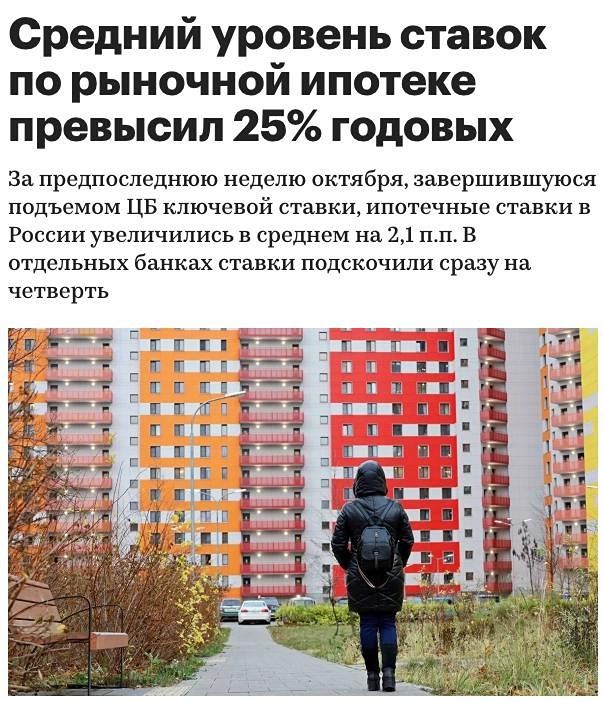Средний уровень ставок по рыночной ипотеке превысил отметку в 25% годовых. С 21 по 27 октября восемь крупнейших банков увеличили ставки на 0,9–7 процентных пунктов, что привело к росту средних ставок на новостройки до 25,4%, а на вторичное жильё — до 25,43%. Транскапиталбанк установил ставки на уровне 27,75%, Совкомбанк — 25,99%, а Сбербанк — 25,2%. ВТБ поднял ставки до 26% для новостроек и до 26,7% для вторичного жилья. Ставки на ипотеку для строительства и приобретения загородного жилья также возросли, составив в среднем 25,47%.
