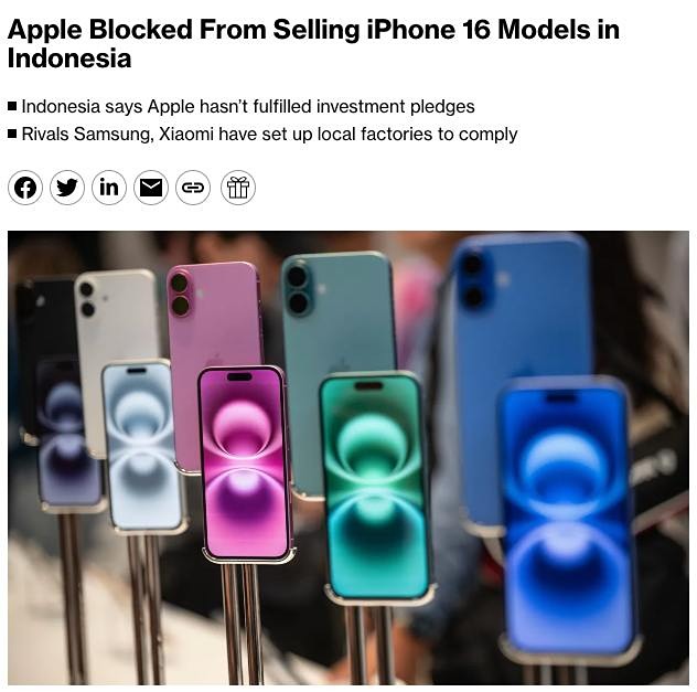 Индонезия запретила продажи новых смартфонов Apple ($AAPL) из-за невыполнения компанией инвестиционных условий. Этот запрет не касается других продуктов Apple, сообщает WSJ