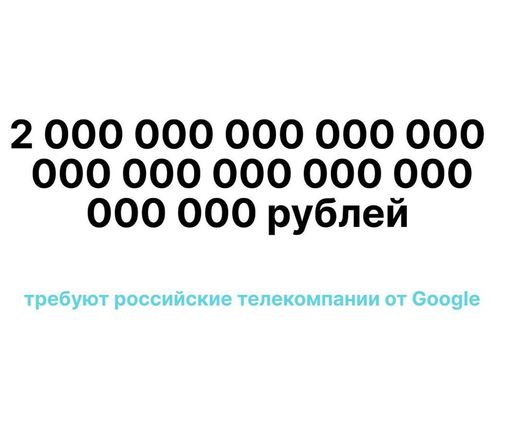 Российские телеканалы подали иск к корпорации Google на сумму в два ундециллиона рублей (единица с 36 нулями), сообщает РБК. Причиной иска стало блокирование аккаунтов ряда российских медиа на платформе YouTube. Известно, что в деле участвуют такие телеканалы, как «Звезда», «Первый канал», «Москва Медиа», «ТВ-Центр», НТВ, «Россия 1», «Россия 24», а также другие. В общей сложности в качестве третьих лиц обозначено 17 телеканалов.