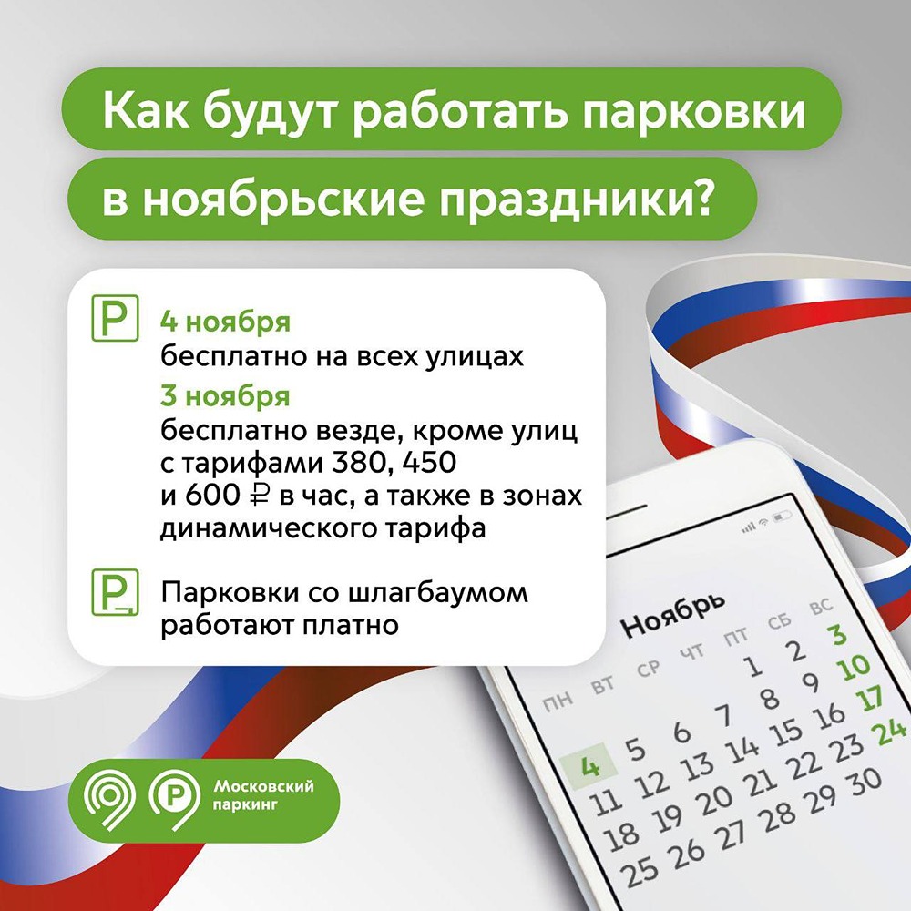 В День народного единства на всех улицах столицы будет предоставлена бесплатная парковка. 3 ноября действовать будет режим воскресенья, однако парковочные места со шлагбаумами продолжат работать по обычным тарифам.