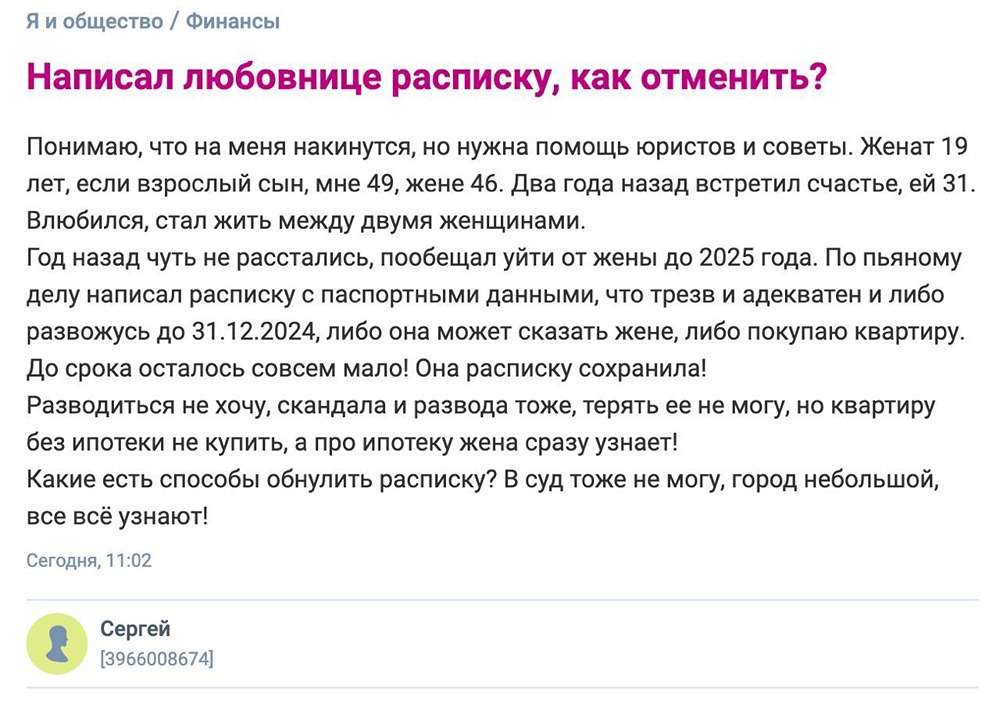 В состоянии алкогольного опьянения россиянин написал расписку любовнице, в которой пообещал оставить жену до 2025 года или приобрести ей квартиру. Теперь он находится в панике и обращается за помощью к юристам, так как у него нет денег, чтобы уйти от жены, и он не хочет этого делать. В маленьком городе его беспокоит, что все могут узнать о его поступках и начать обсуждать.