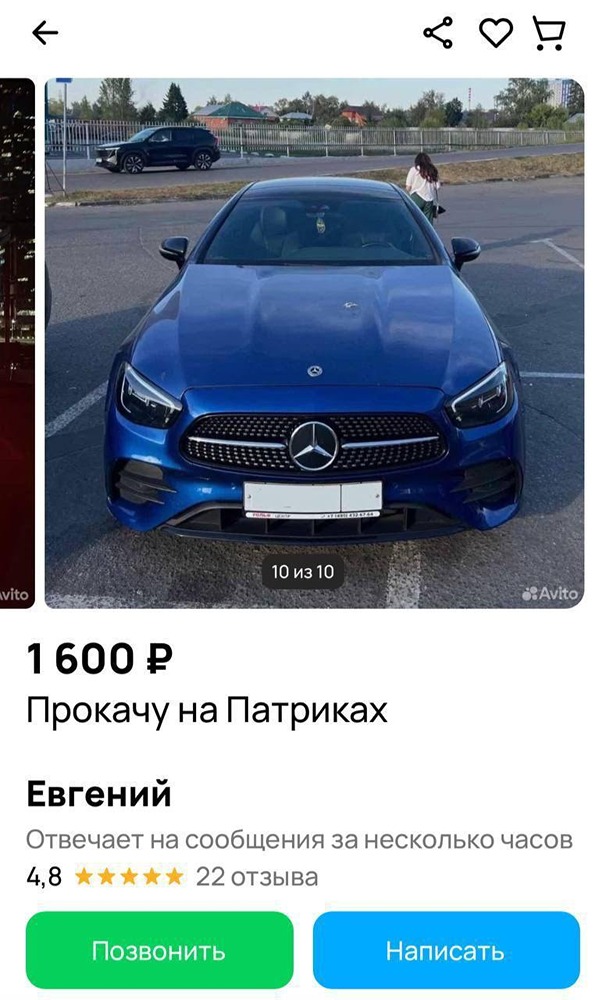 Москвич решил заняться необычным бизнесом — он предлагает прокатиться на дорогих автомобилях по Патриаршим прудам. В своём объявлении он предлагает «навестить бывшего» на BMW 8, BMW M5 sport, Porsche Panamera GTS и других люксовых моделях.