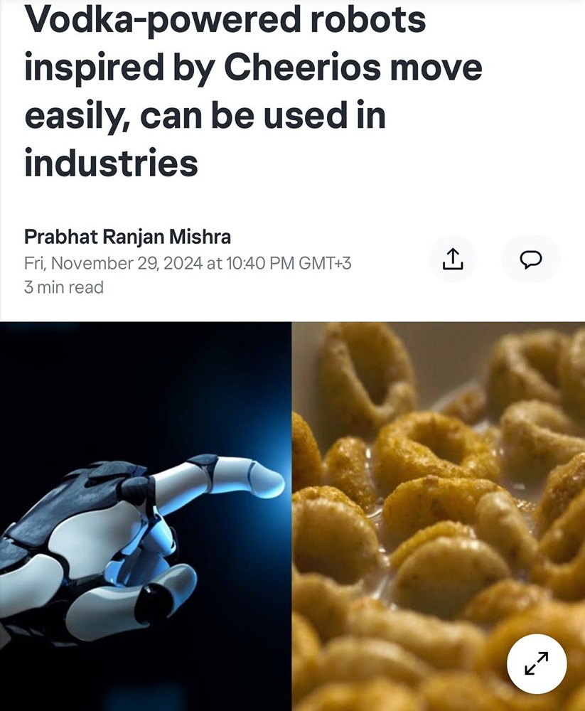 Учёные из Гарвардского университета создали необычных роботов, которые могут работать на алкоголе. По задумке авторов, чем крепче напиток, тем быстрее будет двигаться их изобретение. В ходе эксперимента выяснилось, что лучшими «двигателями» для таких роботов оказались водка и абсент, тогда как пиво показало менее впечатляющие результаты.