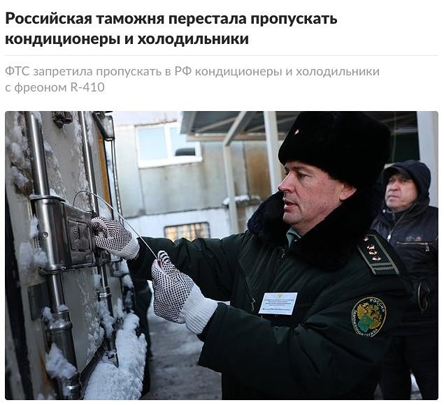 По сообщениям СМИ, в России может возникнуть нехватка холодильников и кондиционеров. Это связано с изменениями в правилах ввоза техники, которая содержит фреон-410. Таможенники перестали пропускать такие устройства. Поставщикам теперь необходимо получить дорогостоящую лицензию, а процесс её выдачи может занять до 45 дней. Из-за этой ситуации на границе может скопиться до 400 контейнеров с техникой на сумму до 2 миллиардов рублей.