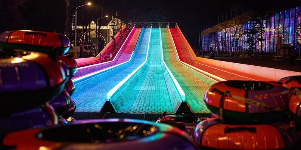 Зимние развлечения на ВДНХ. Недалеко от павильона №57 открылась 80-метровая тюбинговая горка, на которой можно весело провести время всей семьёй. Одновременно работает сразу пять спусков, что делает горку особенно привлекательной для любителей активного отдыха. Особенно приятно прокатиться по горке вечером, когда она сияет разноцветной подсветкой, создавая атмосферу волшебства.
