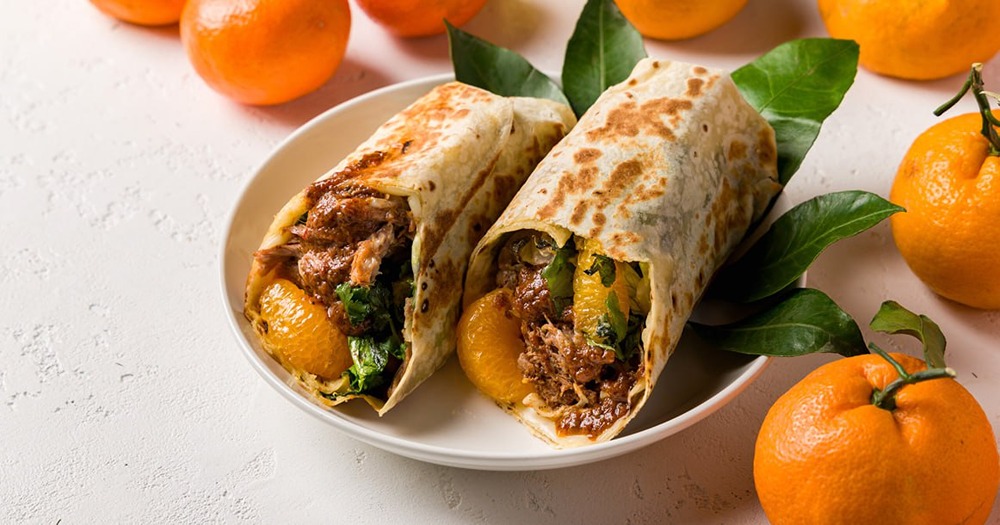 На Центральном рынке можно попробовать новогоднюю шаурму с мандаринами. Этот деликатес обойдётся вам в 800 рублей. В шаурме, которую вам предложат, томлёное утиное мясо будет завернуто в пшеничную лепёшку. Также в составе будет салат айсберг, сулугуни, копчёный перечный соус и, конечно, дольки мандарина.