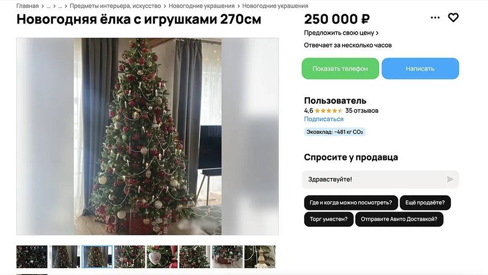 В Москве можно приобрести уже украшенную новогоднюю ёлку высотой 270 см по привлекательной цене 250 тысяч рублей. В набор входят стеклянные игрушки, 100-метровая гирлянда «роса», бусы и подарочные коробки. Продавец предлагает услугу доставки и украшения ёлки на месте.