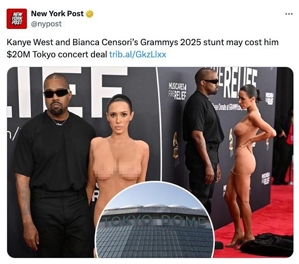 Канье Уэст расторг контракт. Канье Уэст расторг контракт на 20 миллионов долларов, который предполагал его выступления в Токио, после того как он появился на красной дорожке премии «Грэмми» с женой Бьянкой Цензори в провокационном наряде.