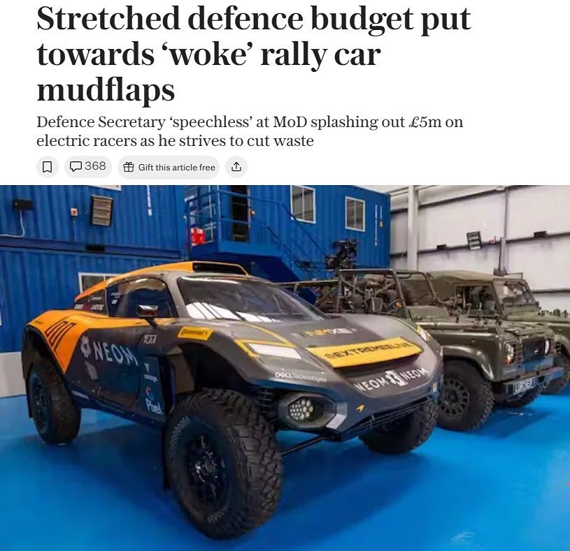 Британское Министерство обороны вложило пять миллионов фунтов стерлингов в поддержку гоночной команды McLaren. Эти средства были использованы для размещения логотипа ведомства на брызговиках электромобиля, участвующего в ралли. Министр обороны был возмущён тем, что деньги налогоплательщиков были потрачены на «нечто подобное». Он принял решение расторгнуть контракт с командой.